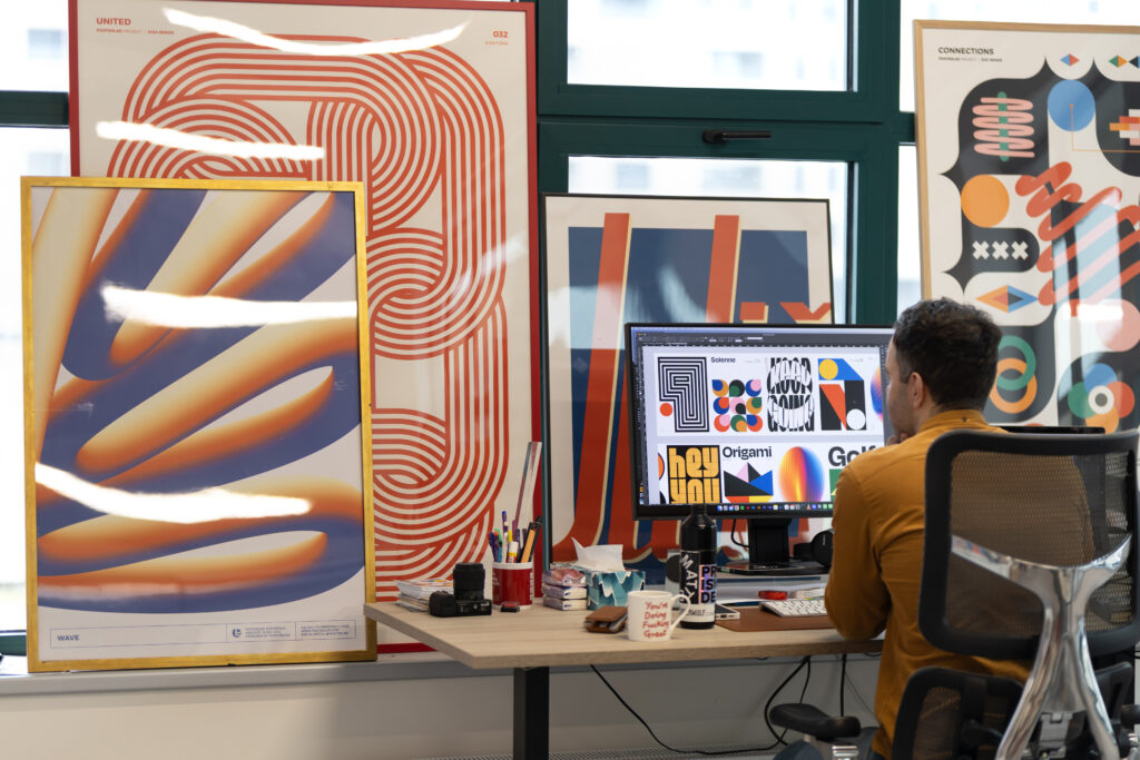 Většina designérů si něco načrtne a pak to dál rozpracuje. Já začnu třeba dvěma kruhy, přidám čtverec a uvidím, co se bude dít dál. Je to taková hra. Často návrh zahodím, ale někdy z něj vznikne něco dobrého. Občas mám hotovo za deset minut, jindy se k návrhu několik dní vracím. Nejvíc času ale stejně strávím nad kompozicí a barvami.